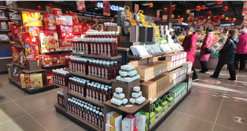 步入茶叶专区,开放式货架上分类陈列着琳琅满目的茶叶产品,形成一道清新雅致的视觉风景线。专区产品选择丰富,覆盖不同场景需求。其中精致的礼盒装茶叶适合馈赠与收藏,凸显地域特色与文化韵味;而非礼盒装的散茶与罐装等系列,则满足了日常饮用的需求,涵盖绿茶、红茶、藏茶等多类品种。此外,针对现代快节奏生活,货架还陈列了多款便携瓶装茶饮,即开即饮,兼顾口感与健康,成为不少年轻顾客驻足挑选的亮点。