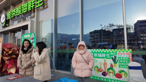 超市门口,精心设计的熊猫主题美陈打卡框成为首批顾客的驻足热点。融合熊猫可爱形象与新鲜果蔬元素的趣味背景,吸引了众多家庭、年轻人拍照打卡。不少顾客表示,轻松有趣的打卡环节让他们在购物前先收获了一份好心情,也为超市增添了鲜明的记忆点。